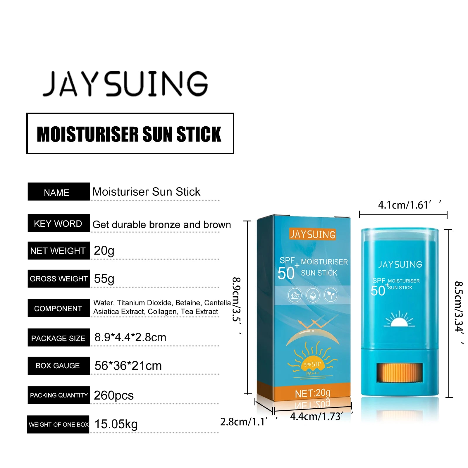 This Jaysuing SPF50+ sun stick is suitable for all people and designed for facial use, providing effective UV protection and long-lasting sunblock benefits. It is CPNP certified, ensuring quality and safety, and contains no high-concern chemicals. Formulated with natural plant ingredients, this lightweight, non-greasy sun stick is waterproof, sweatproof, and hydrating, making it perfect for daily use. It helps prevent sunburn while offering a refreshing protective layer for the skin. Manufactured in Mainland China by Jaysuing, it comes as a 20g single-unit pack with a shelf life of 3 years. Ideal for maintaining healthy, moisturized, and protected skin under the sun.